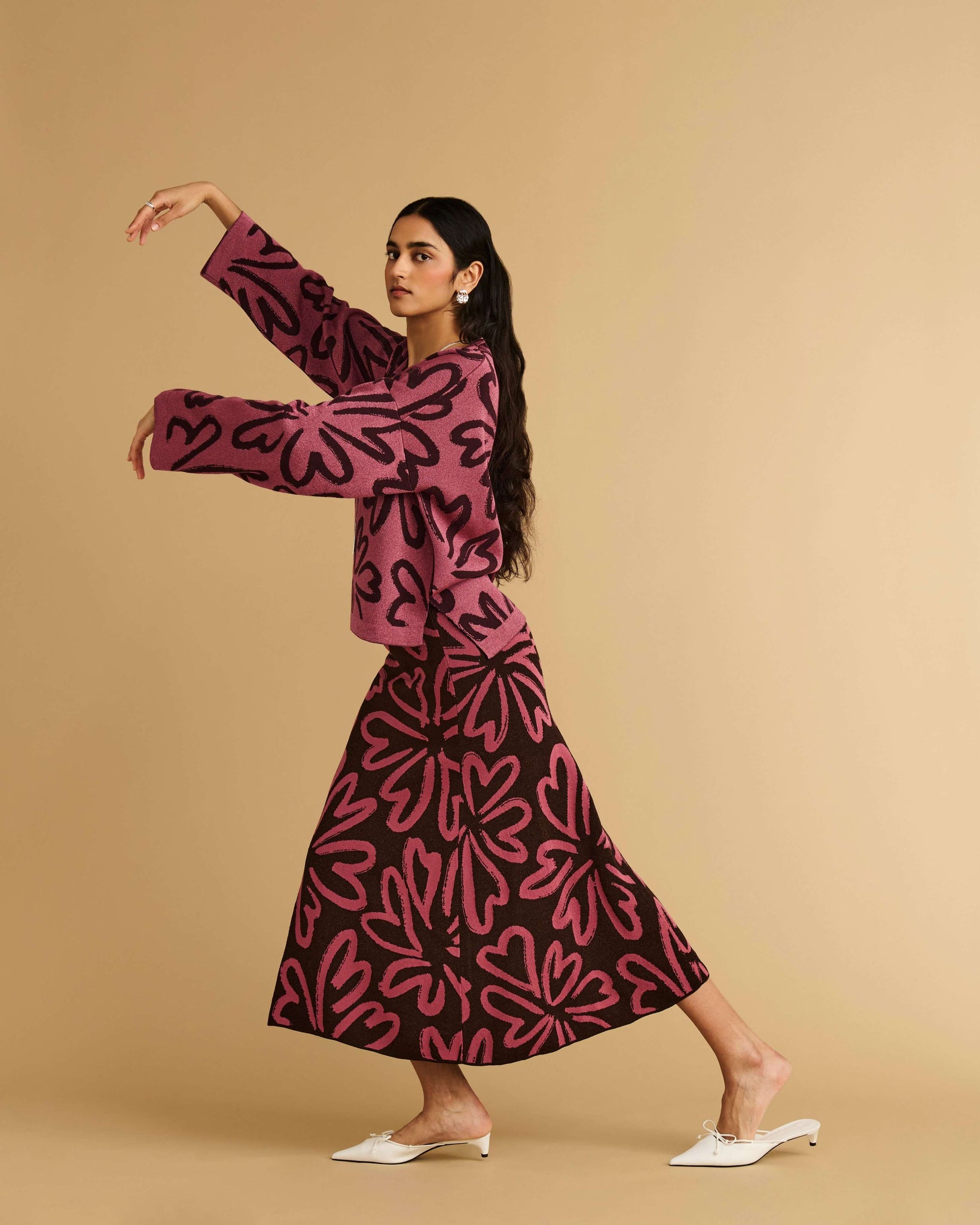 A fully-fashioned jacquard knitted midi skirt with flared hem and elastic waist featuring our painted floral artwork in two tone colour. This style is constructed in our chocolate/antique rose colourway.