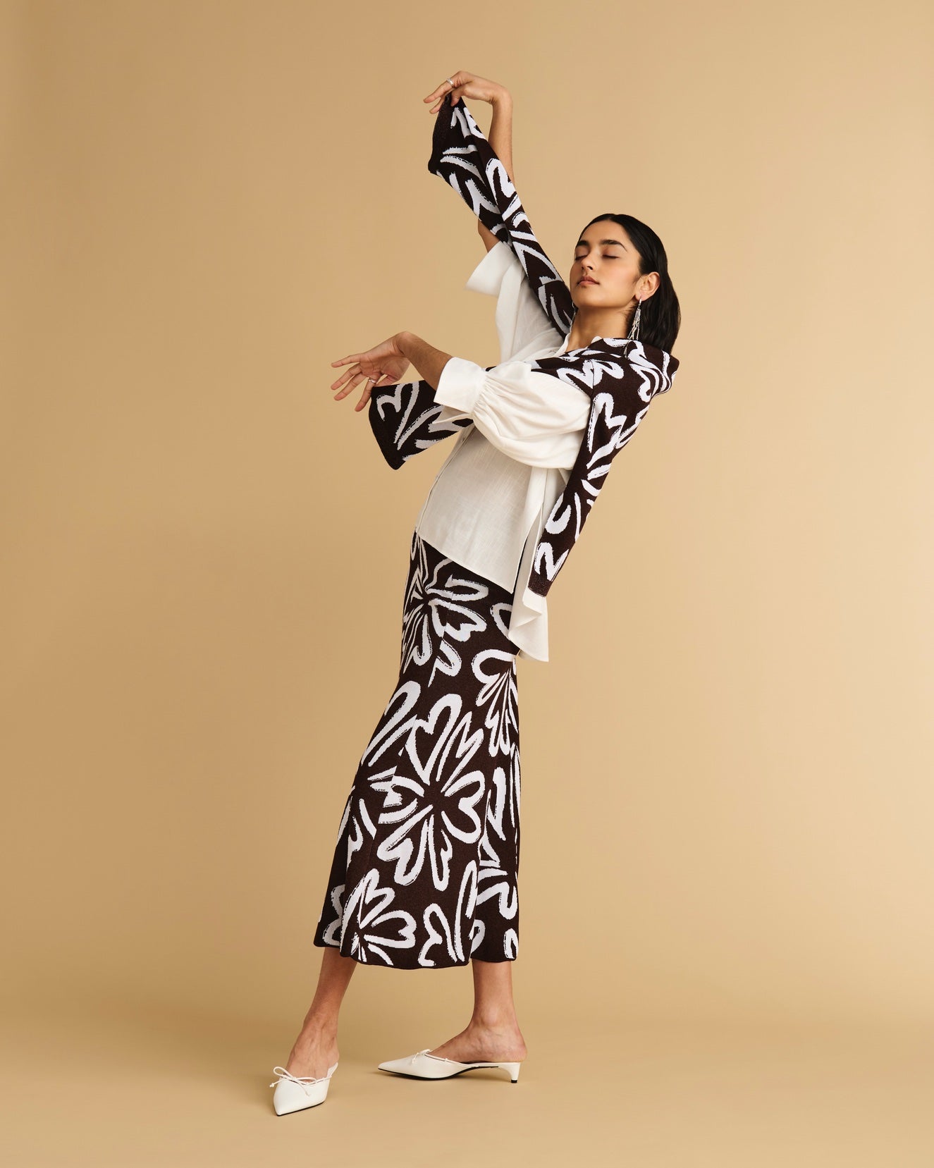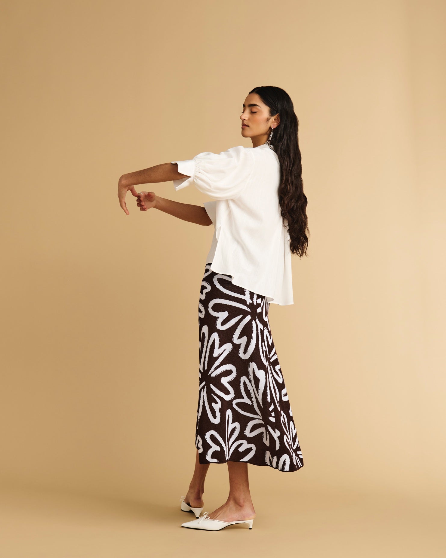 An easy button-down shirt with voluminous ¾ blouson sleeves, deep back body pleat, and stepped hem. This style is made from a deadstock-sourced cotton fine poplin in our ivory colourway.