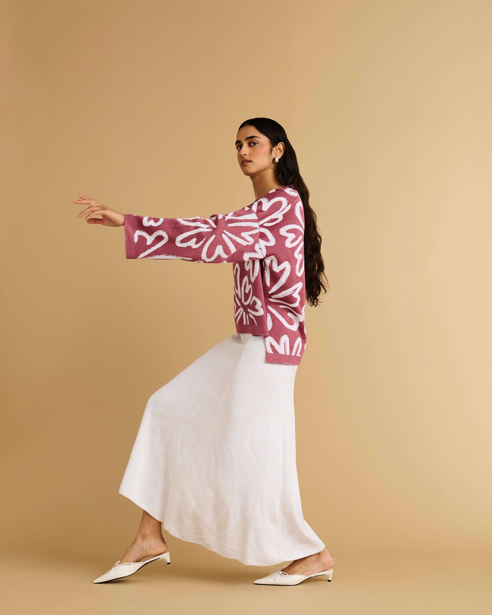 A fully-fashioned jacquard knitted midi skirt with flared hem and elastic waist featuring our painted floral artwork in two tone colour. This style is constructed in our white/white colourway.